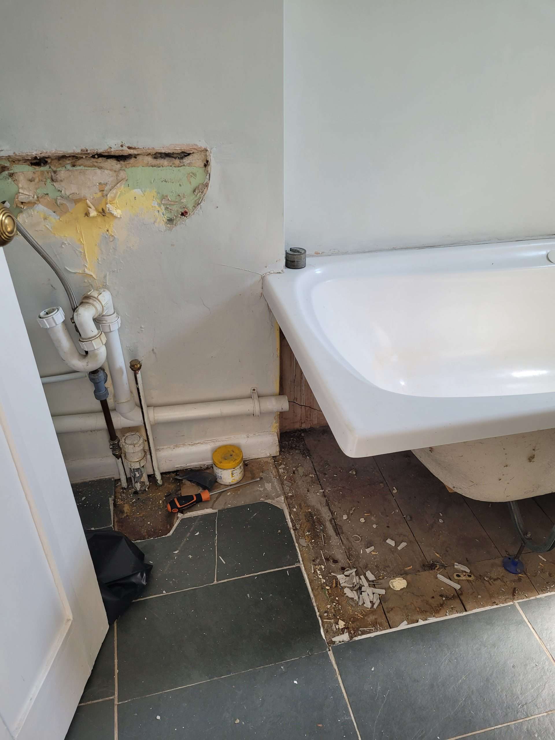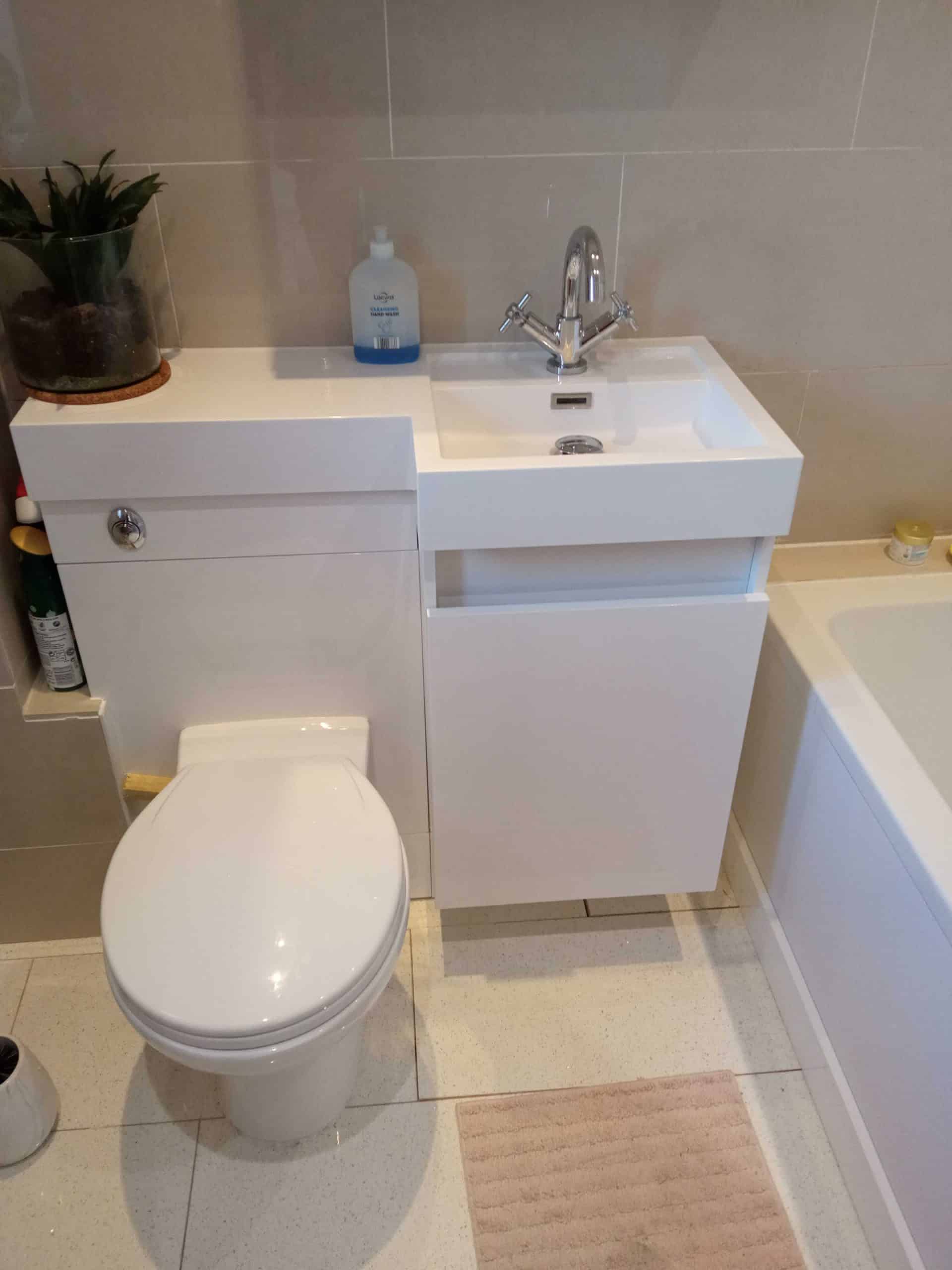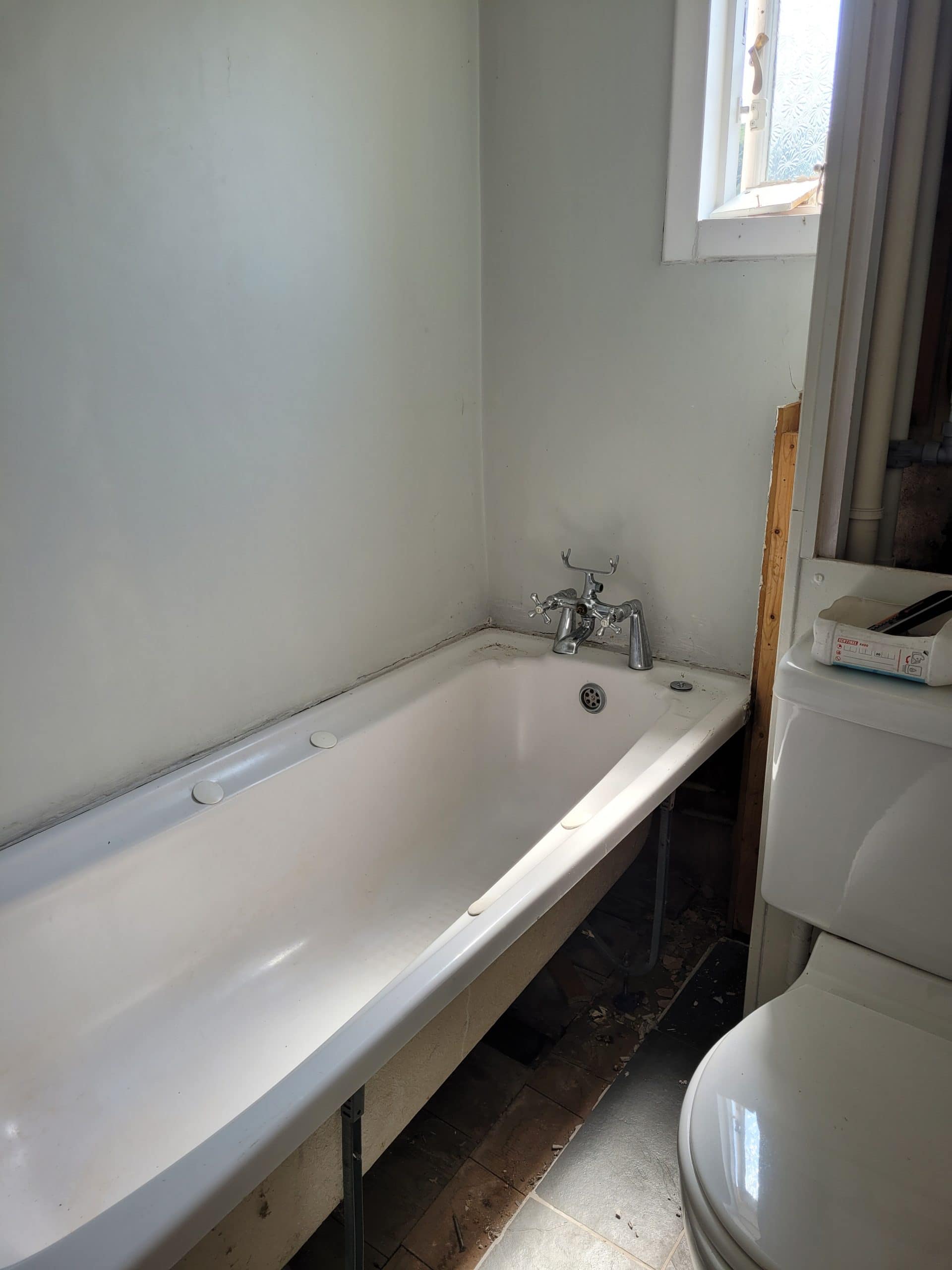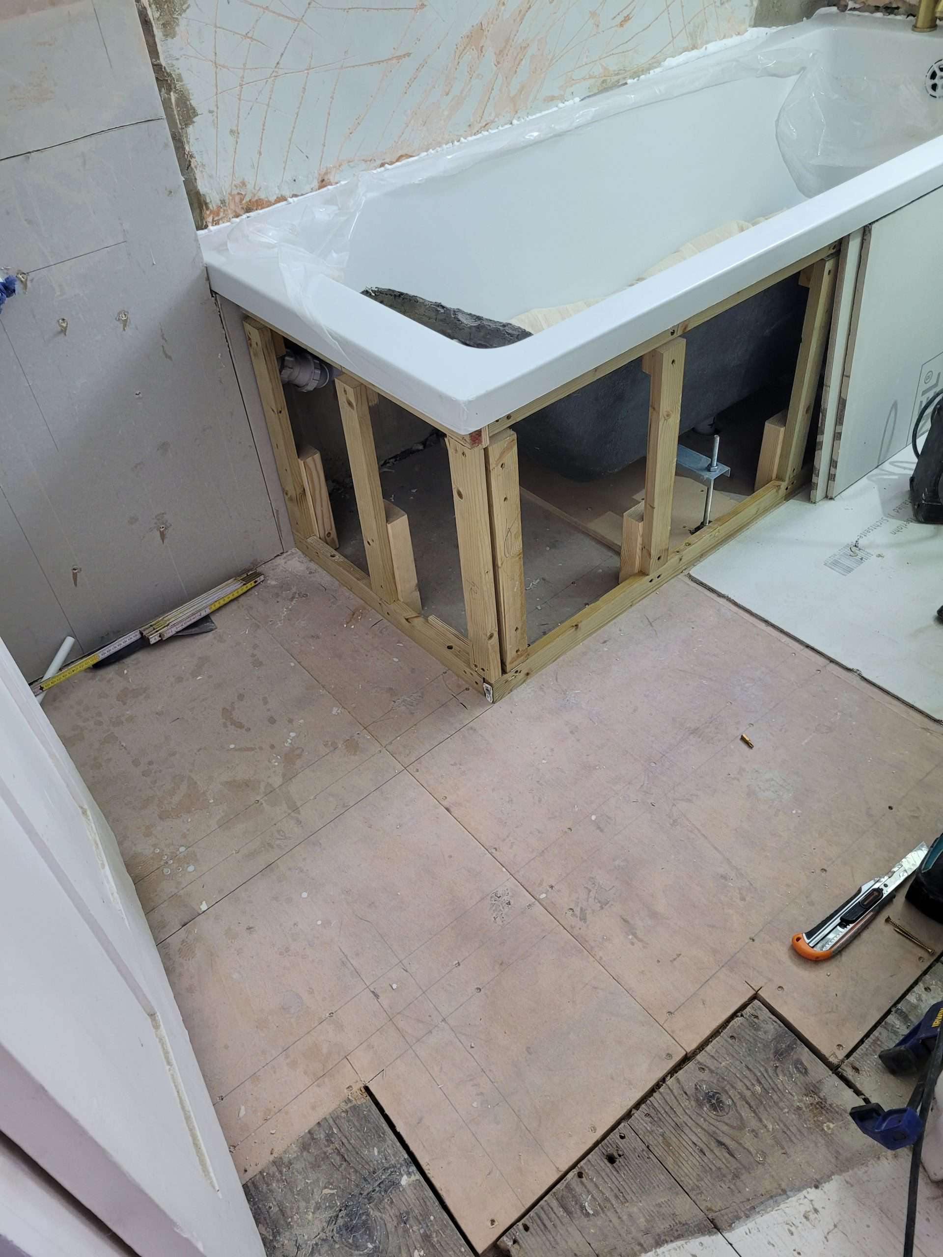 After stripping-out the old bathroom it was immediately obvious that the floor needed reinforcing. Once done, the bath needed to go in before I could use my carpentry skills to build a bespoke cupboard. A small false wall was also made to hide the basin pipework (which looks great!, btw).